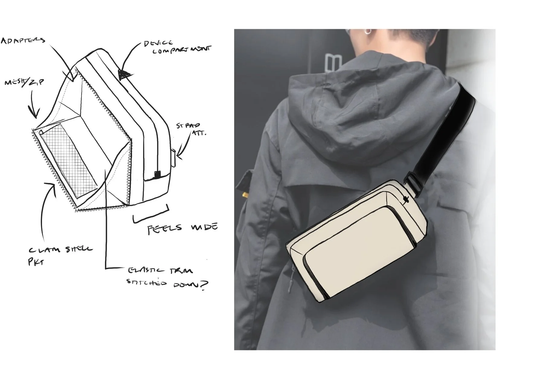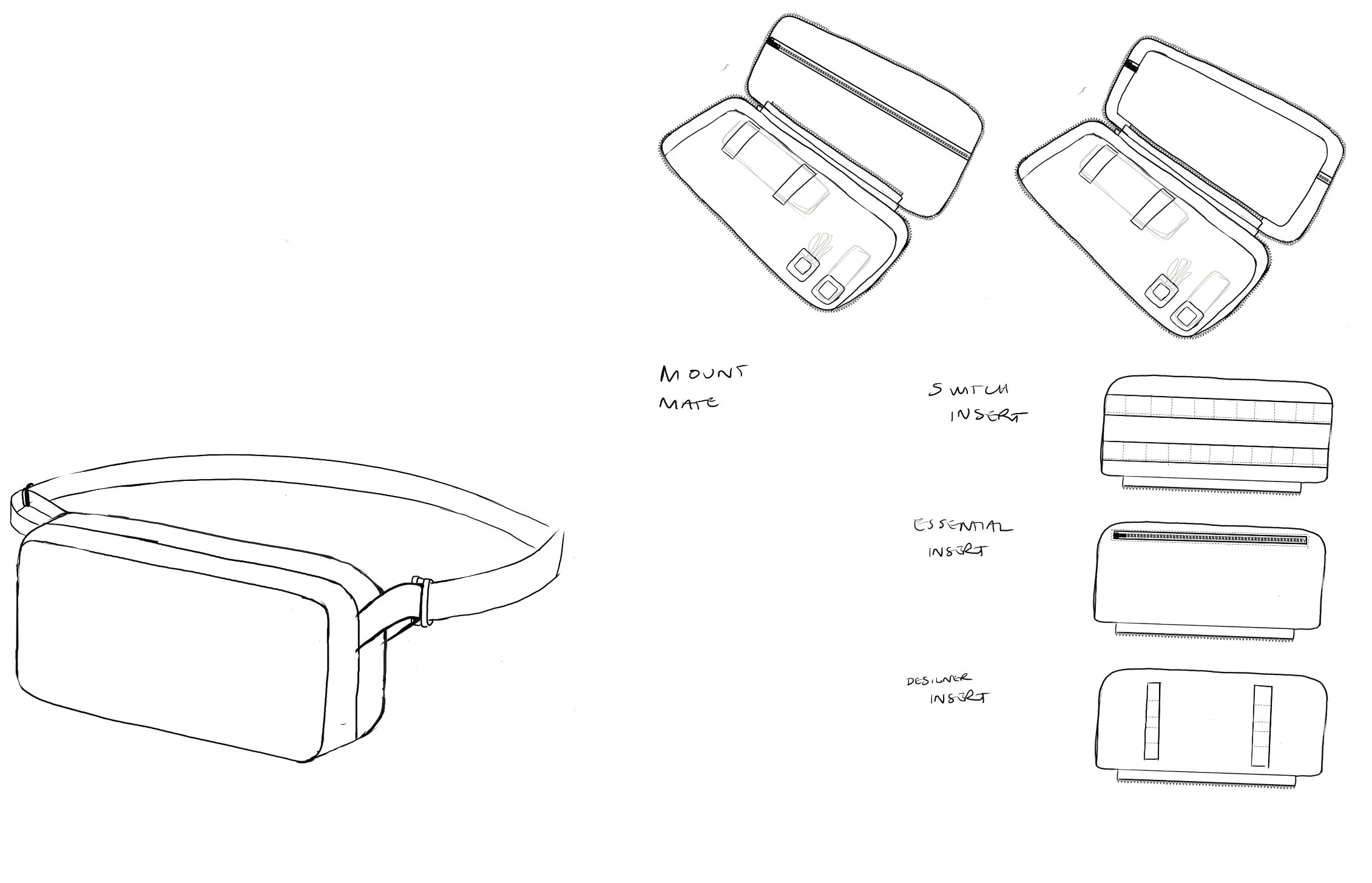 I sketched out some initial ideas on the shape of the bag, more of a rectangle to fit a portable gaming console. But I wanted to add another compartment to keep things organized and secure. The client also wanted to stitch in an adapter mechanism so consumers could snap in the product to the bag.